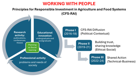 The sustainable development of agrifood systems is a pressing global challenge, highlighting the need for frameworks that guide responsible investment and community engagement. The Principles for Responsible Investment in Agriculture and Food Systems (CSA-IRA), approved by the Food Security Council in 2014, provide such a framework. Recognizing this opportunity, the FAO selected the Gesplan Research Group of the Polytechnic University of Madrid in 2016 to promote these principles in Latin America, the Caribbean, and Spain, leveraging the expertise of PhD graduates in Projects and Planning for Sustainable Rural Development. The main objective of this research was to explore how teaching, research, and civil society engagement can be integrated to operationalize CSA-IRA principles and foster sustainable development. To achieve this, the study applied the “Working with People” model across multiple countries and contexts, using university–business collaborations to implement practical, socially responsible initiatives. Over nine years, the approach generated a network of 46 universities and 52 agrifood companies across 12 countries, demonstrating effective multi-stakeholder collaboration. The accumulated experience led to the proposal of the Metauniversity—a “university of universities”—as an innovative instrument to scale knowledge transfer, research, and community engagement. These findings highlight that structured, collaborative networks can translate CSA-IRA principles into tangible actions, offering a replicable model for sustainable agrifood development globally
