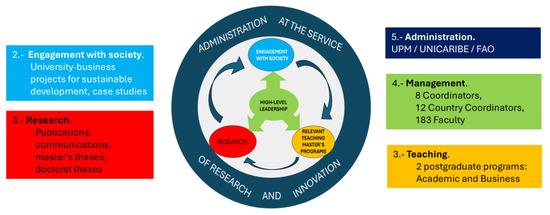 The Polytechnic University of Madrid (UPM) elected a new rector in 2004 who, along with his team, undertook as a governance program the goal of transforming the institution into a research university within the eight-year duration of his mandate. The governance measures and their impact on rankings were significant—the creation of research structures, master’s programs, and stronger engagement with society, among many others—which positioned UPM among the top 300 universities in the world [1]. One of the research groups at this university, known as Gesplan (Research in Planning and Sustainable Management of Rural/Local Development) [19], had been working for years under this approach—one of its members had been trained at UC Los Angeles—establishing a network of PhD holders in Latin America (LA) and Spain, many of whom are faculty at universities in those countries. This drew the attention of the FAO in 2016 to undertake a very innovative program—the first of its kind—to connect the United Nations multilateral organization with universities, the business sector, and associative and cooperative networks to promote the dissemination of the CSA-IRA Principles in Latin America and the Caribbean (LAC).