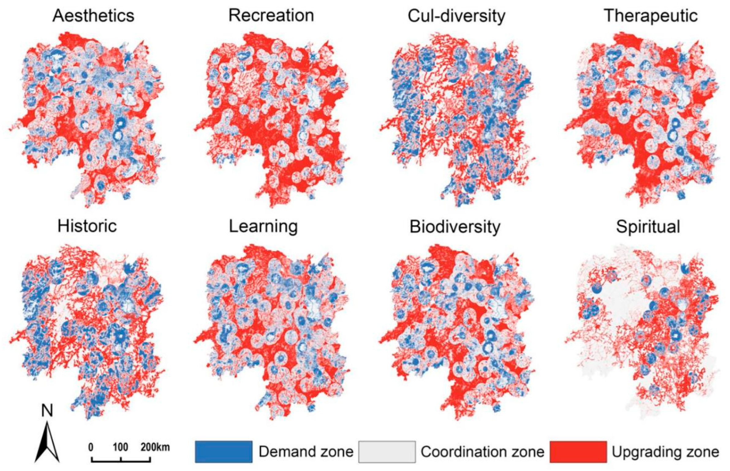 Enhancement zones occupy over 20% of the land area, generally exhibiting a “medium-supply–low-demand” structure. Among all categories, Recreational services comprise the largest proportion (49.5%), followed by therapeutic (37.1%) and biodiversity (34.2%), while spiritual services hold the least proportion (24.6%). The proportions of other CES categories were relatively similar.