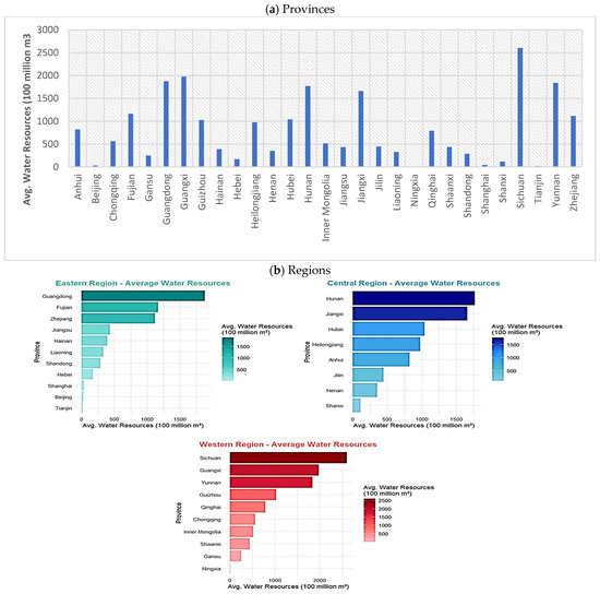 China is also grappling with a substantial challenge as the accessibility of water resources begins to restrict the country’s economic and social advancement [6]. China’s gross domestic product per water unit is considerably lower than the global average [7]. On a global scale, the average GDP per cubic meter of water is approximately USD 36, whereas in China, it is roughly USD 3.50 [8]. China thus needs more water to thrive economically. Increasing product production in China requires an increasing amount of water, yet these must be produced with fewer resources [9]. Furthermore, the differences in China’s water resources among provinces are another challenge. Figure 1a,b shows the average total water resources of China’s provinces and regions from 2008 to 2021. It shows that the provinces of Ningxia, Beijing, Shanghai, and Tianjin have the lowest amount of water resources (supply of water resources) (ranging from 10.37 to 43.12 m3). Meanwhile, the total water resources in ten provinces (Jilin, Shaanxi, Jiangsu, Hainan, Henan, Liaoning, Shandong, Gansu, Hebei, and Shanxi) are in the lower–middle range (116.67–446.69 m3). The total water resources in Heilongjiang, Xinjiang, Anhui, Qinghai, Chongqing, and Inner Mongolia possess range from 516.80 to 977.08 m3. The rest of the provinces; for instance, Guangxi and Sichuan have the highest total water resources (avg 1976.309m3 and 2603.495 m3, respectively). Figure 1b shows the average total water resources of China’s regions.