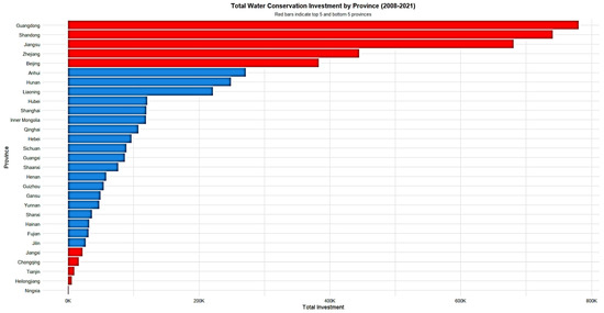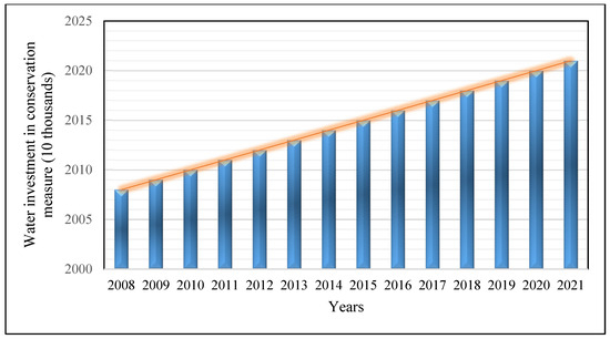 Tibet province is home to large glaciers, high-altitude lakes, and Asia’s major rivers, such as the Yangtze, Mekong, and Brahmaputra. The province’s glaciers and snowpacks supply freshwater to downstream China and neighboring countries [10]. Relatively scarce water resources characterize the central region of China compared to the Western and Eastern regions. As water demand rises, China must explore technological solutions to manage water resources and increase water usage efficiency, with water-conserving technologies such as sprinkler irrigation, water recycling, and reservoirs being the most promising options. Sprinkler irrigation systems have been designed to distribute water to crops effectively, hence reducing losses caused by evaporation and runoff [11,12]. This water-efficient approach in agriculture has the dual benefit of also enhancing agricultural yields. In the realm of water management, water recycling has emerged as a viable solution [13,14]. This procedure involves treating wastewater and reproducing it for non-potable uses such as industrial operations and landscape irrigation [15]. It alleviates the strain on freshwater resources, leading to water conservation and pollution reduction. Moreover, constructing reservoirs through damming rivers or streams allows water to be stored during seasons of high precipitation, guaranteeing a reliable and uninterrupted water supply, especially in areas characterized by seasonal variations in rainfall patterns. China is also developing technologies and investing in water conservation measures. However, Figure 2 shows the disparities in water investment across provinces. Guangdong, Shandong, and Jiangsu show higher investment ratios for water-saving measures than other provinces. Despite that, Figure 3 shows the investment in water conservation increased from 2008 to 2021.
