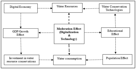 The chain between the digital economy, water resources, conservation technologies, and water consumption. Note: This conceptual framework illustrates the moderating effect of the digital economy on water conservation technologies. The directional arrows represent the flow of influence between variables, with digital technologies acting as a moderator to enhance the effectiveness of conservation technologies.