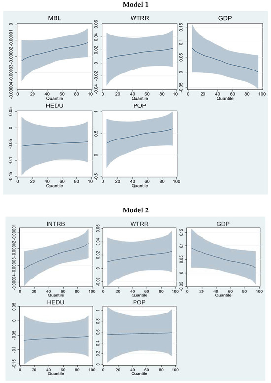 Empirical findings from the M-MQR method are described in Table 2. The quantile findings are emphasized for lower (10th), middle (50th), and higher (95th) quantiles of China’s water resource consumption. The M-MQR findings involve three main domains of the models. The first domain (Models 1–6) highlights the importance of the digital economy’s impact on water resource consumption. For that, this study used the four main internet technologies (mobile, internet users, internet access, and tele business) that represent economic digitalization. Model 1 shows that mobile technology reduces the total water resource consumption in China’s provinces. The reduction intensity, though lower, is highly significant throughout the quantiles.