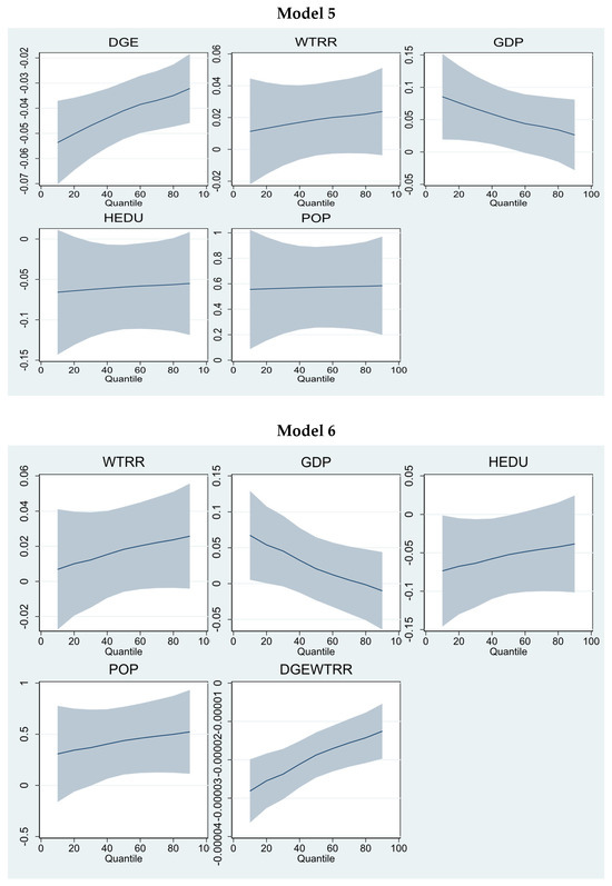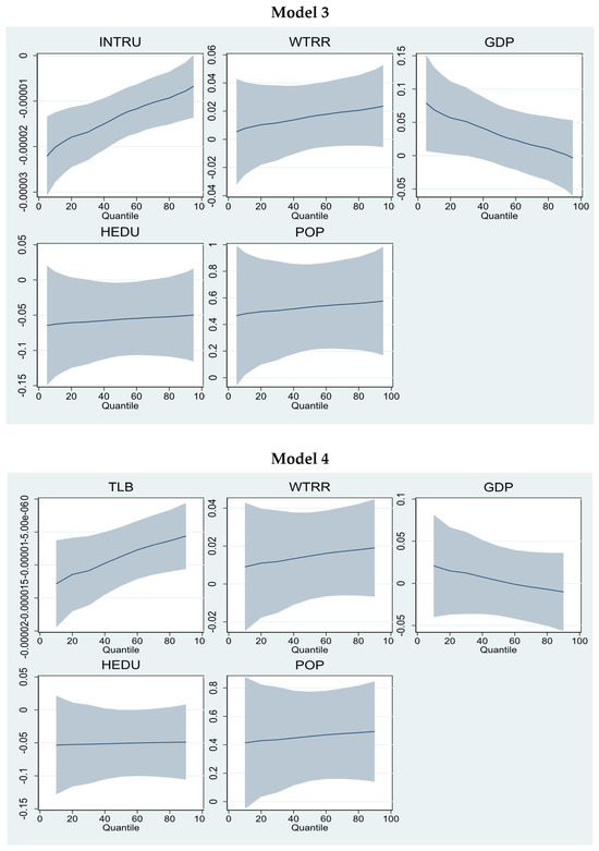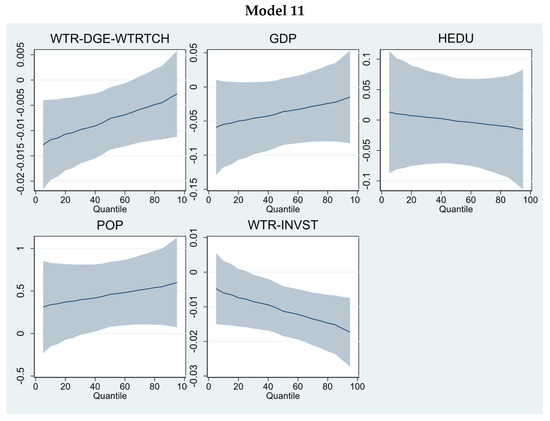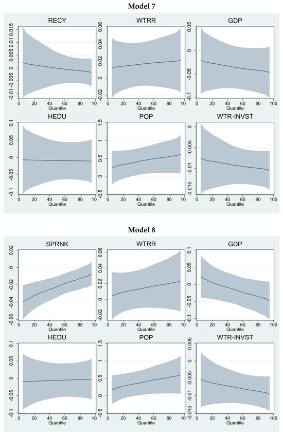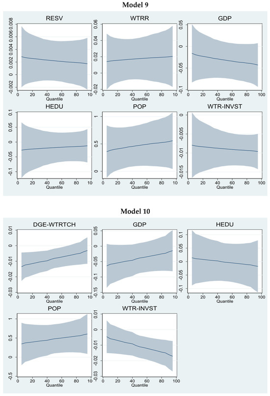 Models 7 and 9 incorporate water conservation technologies related to water recycling, sprinkler irrigation methods, and water reservoirs. The findings show that water recycling and sprinkler irrigation can reduce water resource consumption. However, water recycling is statistically insignificant. In contrast, sprinkler irrigation is significant at lower and higher quantities only. Similar findings can be found in Figure 5. However, a positive but statistically insignificant trend was found for water reservoirs. The most important finding is the impact of water-saving technology investment. The findings reveal that investment plays a positive role in reducing water resource consumption pressure. The co-efficient impact at higher quantiles is −0.0105 (Model 7), −0.00946 (Model 8), and −0.00962 (Model 9), showing its strength in water resource conservation. Similar findings are presented in Figure 6. Models 10 and 11 show that Moderators 2 and 3 can potentially reduce water resource consumption. However, these are more robust at lower (−0.0124, −0.0118) and middle (−0.00812, −0.00761) quantiles rather than higher quantiles.