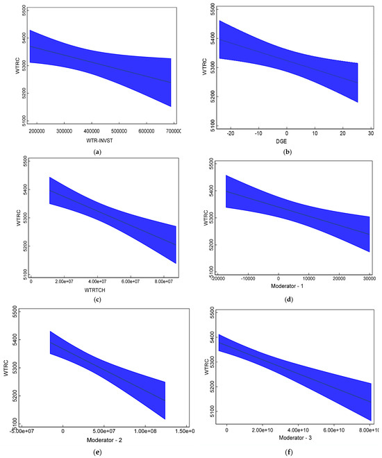 Figure 6 presents a graph assessing the relationships between the core regressors. Figure 6a shows that the impact of water-saving investment trends negatively. This validates the findings of this study and emphasizes the importance of investment for handling China’s water issues. Figure 6b,c highlight the importance of the digital economy and water conservation technologies to improve the water consumption pattern. In Figure 6d–f, the moderators are plotted against water resource consumption to assess the significance of the digital economy and water conservation technologies in preserving water resources by reducing water consumption. The prevailing trend across all graphs is negative, implying that technologies significantly reduce water resource consumption in China. Accordingly, these findings strengthen the conclusions presented above and support the idea that the digital economy can enable China to be more efficient in water management through the adoption of internet, smart grid, and water conservation technologies.