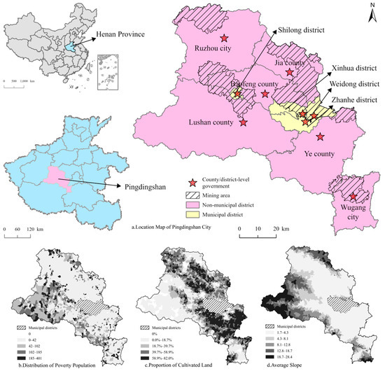 Pingdingshan City, located in Henan Province of central China, serves as the study area. The analysis focuses on rural households located in non-municipal districts of Pingdingshan City, excluding the urban municipal districts. These areas represent the administrative units under county-level jurisdiction, where rural poverty alleviation policies were primarily implemented. The city spans mountainous regions in the west, hilly zones in the center, and flat plains in the east, with mineral resources concentrated in the central and western subregions. Location and village-level maps (Figure 1) illustrate the city’s administrative position as well as variations in slope, cultivated land, and the poverty population. These spatial contrasts highlight the pronounced heterogeneity of natural conditions, resource endowments, and settlement patterns, which shape diverse household livelihoods and offer an appropriate context for analyzing differentiated poverty alleviation pathways.