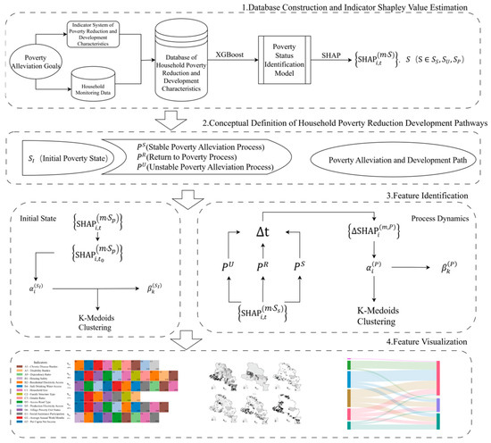Drawing on the above research progress and addressing these gaps, we advance a path-aware, explainable agenda at the household scale, linking conceptual framing, model development, and empirical validation. Accordingly, we set out three research objectives, which also constitute this study’s contributions to the literature: First, it introduces the concept of household poverty alleviation and development pathways, integrating both “poverty states” and “poverty processes” into a unified framework that enables a dynamic and systematic understanding of poverty alleviation. Second, it constructs an explainable machine learning framework that combines XGBoost with SHAP to identify heterogeneous state–process transitions, thereby offering both methodological rigor and interpretability. Third, it empirically applies this framework to large-scale, fine-grained monitoring data from Pingdingshan City, uncovering diverse household pathways and their spatial heterogeneity, and generating insights for differentiated poverty prevention and sustainable rural development strategies. The remainder of this paper is structured as follows: Section 2 outlines the conceptual framework and methodological design, Section 3 reports the empirical results, Section 4 discusses implications, and Section 5 concludes.