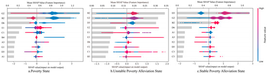 Overall, per capita net income (G2), residential electricity access (B2), access road type (D3), and village poverty exit status (D6) consistently rank among the top ten indicators across all three states in terms of SHAP values. From the perspective of indicator composition, as households transition from the poverty state toward the stable poverty alleviation state, the top ten indicators shift in emphasis—from those primarily reflecting housing facilities and living burdens to those highlighting development-support measures and production resources.