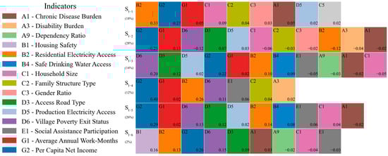 To facilitate both cross-sectional comparison and longitudinal trend analysis, we further calculated the indicator-level SHAP influence coefficients and the dimension-level SHAP influence coefficients , following the same procedure used in the identification of initial-state features. A larger indicates that indicator plays a more critical role in supporting households’ transition toward stable poverty alleviation during the corresponding stage, whereas a smaller or negative value implies a constraining effect. In parallel, captures the dominant role of dimension within that process stage, thereby providing a clearer understanding of how different dimensions contribute to the evolution of household poverty reduction and development paths.