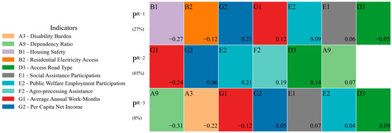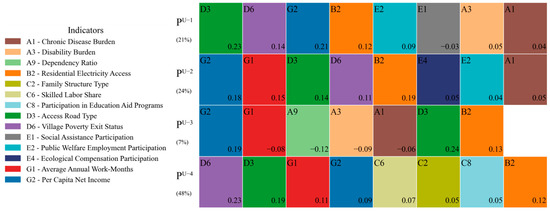 In terms of structural characteristics, is mainly characterized by vulnerabilities in housing and infrastructure conditions, particularly B2: Residential Electricity Access, B1: Housing Safety, and D3: Access Road Type. The re-poverty features of are reflected in strong fluctuations in employment and income indicators, namely G1: Average Annual Work-Months and G2: Per Capita Net Income. By contrast, is closely associated with disadvantages in living burdens, especially A3: Disability Burden.