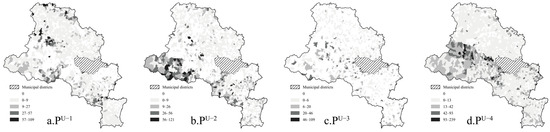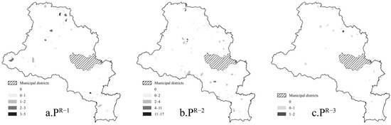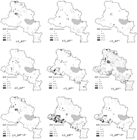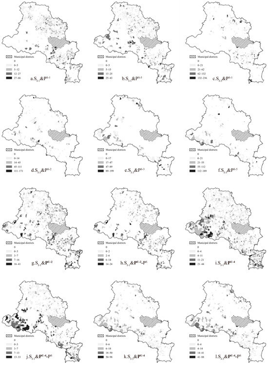As shown in Figure 8 and Figure 9, the cluster centers of the return-to-poverty process () and their spatial distributions are illustrated. Overall, households experiencing re-poverty are primarily associated with disadvantages in the Living Burdens dimension (Category A), the Labor & Income dimension (Category G), and the Housing & Infrastructure dimension (Category B). Among these, is the dominant type, accounting for 65% of the households undergoing this process.
