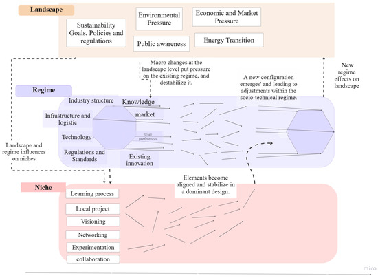 Socio-technical transition is a comprehensive and broad process of change in market behavior, policy, and cultural meaning across the societal system [29], characterized by multi-actor and long-term processes [33]. The Multi-level Perspective (MLP) framework offers a comprehensive system-based approach to help analyze and understand the complex interactions among the dynamics of the transition occurring at different levels of analysis [31,34]. The core idea of MLP is that transitions are complex and nonlinear [35]. Additionally, it results from interactions across three levels of analysis: niches (the micro level), where innovations originate, regime (meso level), where practices and rules are established, and landscape (macro level), which includes external factors influencing the system [31,32,34]. Regimes are nested within the landscape, and niches are embedded within regimes [31,36]. The central core of MLP is that the success of an innovation depends on the process in the niche, development in the regime, and the socio-technical landscape [36].
