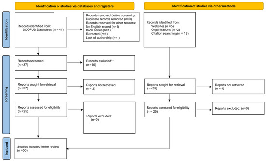 The initial search retrieved 41 records. After automated screening to exclude non-English articles, retracted papers, and book series entries, 37 studies remained for abstract evaluation. Of these, studies that did not focus on the research topic, specifically the implementation of RSA in concrete, were excluded, leaving 27 studies for full-text analysis. However, 2 of these were removed due to the unavailability of full-text access, resulting in 25 studies being included from the database. To ensure comprehensive coverage of the RSA implementation in concrete terms, an additional 25 relevant records were identified through alternative methods, such as citation tracking, and were included in the study. In total, 50 studies were included in the analysis (see Figure 4).