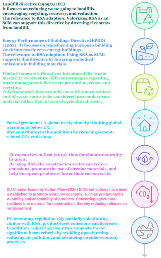 The regulatory and policy frameworks play a critical role in driving the adoption of new materials. There are different global policies that promote the decreasing emission of greenhouse gases and a circular economy, like the Paris Agreement [51] and the Sustainable Development Goals (SDGs), especially SDGs 9, 11, 12, and 13. In the EU, the Circular Economy Action Plan, the European Green Deal [52], and the Energy Performance of Buildings Directive [53] are some examples of regulations and initiatives for adopting sustainable materials, reducing energy consumption, and minimizing waste. Implementing RSA as an SCM in concrete aligns with these regulations and initiatives by repurposing agricultural waste into valuable construction materials (Figure 5).