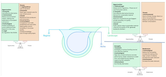 The Life Cycle Assessment results demonstrated that using rice straw as a biomass source for electricity generation, followed by using RSA as an SCM, can offset all significant environmental impacts, assuming substitution for conventional electricity sources [27]. As mentioned in the previous paragraph, there is a lack of studies on the adoption and diffusion of such materials within the European construction sector, highlighting the need for further exploration. To address this gap, the Political, Economic, Social, Technological, Legal, and Environmental (PESTLE) factors influencing the adoption and diffusion of RSA are analyzed as Strengths, Weaknesses, Opportunities, and Threats (SWOT) under the multi-level socio-technical transition framework to comprehensively understand the dynamics at play.