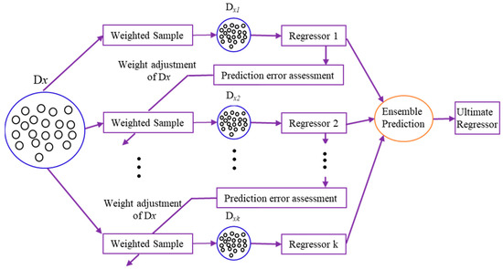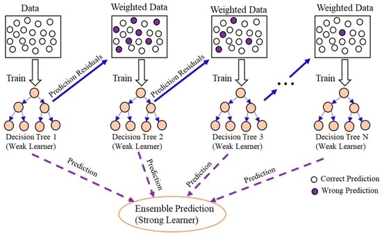 The schematic diagram of Adaboost regression is shown in Figure 3 [46]. The algorithm initiates with a basic model and iteratively introduces subsequent weak models, each concentrating on rectifying the errors of its forerunner. This sequential refinement process sets AdaBoost apart, allowing it to adapt and evolve its predictive ability with each iteration.