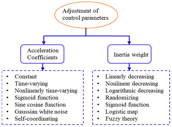 - Control Parameter Adjustment: In the context of PSO algorithm, control parameters refer to inertia weight () and acceleration factors ( and ). One of the critical modifications in MPSO involves the adjustment of these parameters. In standard PSO, these parameters control the balance between exploration and exploitation. Over the last few decades, many strategies have been proposed for the adjustment of these parameters [49,53]. Some of these are listed in Figure 5. In adaptive strategies, these parameters are adjusted dynamically during the optimization process. This adaptation helps in achieving a better balance between global and local search, leading to improved convergence and exploration capabilities.