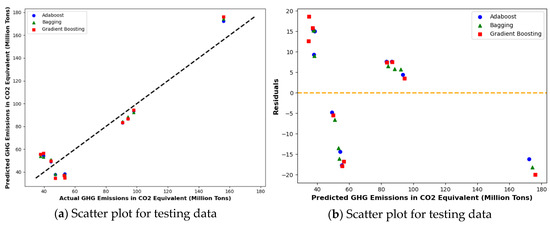 Figure 7a,b depict the training efficacy of three ensemble models, such as Adaboost, Bagging, and Gradient Boosting, in forecasting GHG emissions in Bangladesh. In the scatter plot (Figure 7a), all models exhibit robust concordance with the actual emissions, particularly between 75 and 150 million tons, where data points are positioned near the ideal line. Bagging and Gradient Boosting predictions closely align with the actual trend, however Adaboost tends to underpredict at elevated emission levels (exceeding 175 million tons). In the residual plot (Figure 7b), the residuals are predominantly clustered around zero for most predictions, indicating negligible errors. Adaboost and Bagging exhibit significant positive residuals at lower emission levels (below 75 million tons), indicating underprediction, but negative residuals emerge at higher values, implying overprediction.