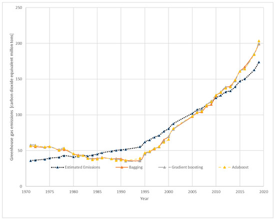 This section presents the results of using several decision tree machine learning algorithms, including the bagged decision tree, boosted decision tree, and gradient boosted decision tree, to forecast Bangladesh’s greenhouse gas emissions. The efficacy of the algorithms will also be checked and verified through standard tests. In addition, the features used in machine learning models will be categorized based on their importance through the Shapley explanation model. The results are presented below under various subsections.