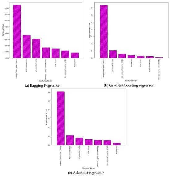 An extensive analysis of vehicle emissions and their impact on policy analysis in South Korea has been presented in [59]. The reference [60] presents a sustainable policy analysis of GHG emissions for the UK, whereas [61] presents a similar comparative analysis across multiple countries. Several works are also conducted in Bangladesh, including [62], which discusses a sustainable waste management policy to reduce greenhouse gas emissions. This study offers data-driven insights that can facilitate informed policy decisions in Bangladesh, as implicitly mentioned in Figure 6. By figuring out what causes greenhouse gas emissions with feature importance analysis, especially how much energy is used, policymakers can see that they should focus on deploying renewable energy, improving energy efficiency, and developing specific plans to reduce carbon emissions that align with international climate goals [63]. The results help link socioeconomic trends to emission patterns, thereby making national climate policies more effective and focused. However, the analysis relies on historical data up to 2019 and excludes scenario-based modeling, policy shifts, or technological advancements, potentially undermining the durability of long-term policy recommendations. Furthermore, this study’s methodological limitation is its exclusive reliance on three ensemble models, such as Bagging, AdaBoost, and Gradient Boosting, neglecting other advanced methodologies such as deep neural networks, hybrid models, or complex time series forecasting techniques (e.g., LSTM, Prophet). This limits the investigation of potentially more potent and resilient predictive methodologies recorded in the literature.