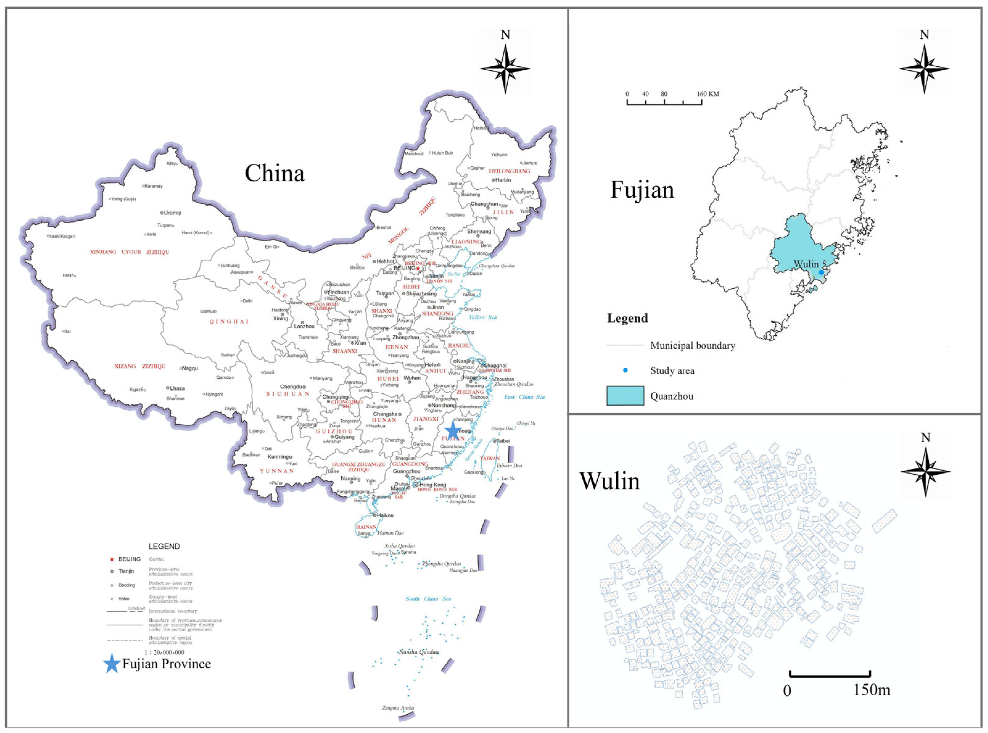 This study selects Wulin Village as a typical case to explore spatial optimization strategies for rural tourism from the perspective of behavioral networks. Wulin Village is located in the southwestern part of Xintang Street, Jinjiang City, Fujian Province, adjacent to the national key project Jinhua Integrated Circuit Industrial Park and the central axis of the Jinjiang–Shishi twin cities, offering convenient transportation with extensive connectivity (see Figure 1). The village is only 2 km from the Jinjiang South High-Speed Rail Station and 6 km from Quanzhou Jinjiang Airport, with a clear advantage of a 10 min living circle. This strategic location provides a solid foundation for absorbing urban spillover and attracting short-term tourists. Currently, Wulin Village faces dual pressures from urban spatial reconstruction and an increase in tourist numbers. Wulin Village covers an area of approximately 1 square kilometer, with a resident population of 2050 and over 12,000 overseas Chinese, making it a typical Minnan overseas Chinese village. The village is situated in a hilly, gentle slope area, with its development adapted to the natural terrain. It benefits from abundant ecological resources, a rich water system, and favorable climate conditions. The natural rural landscape formed along the Wudianxi Stream provides ideal conditions for developing eco-tourism, agricultural experiences, and waterfront leisure spaces.
