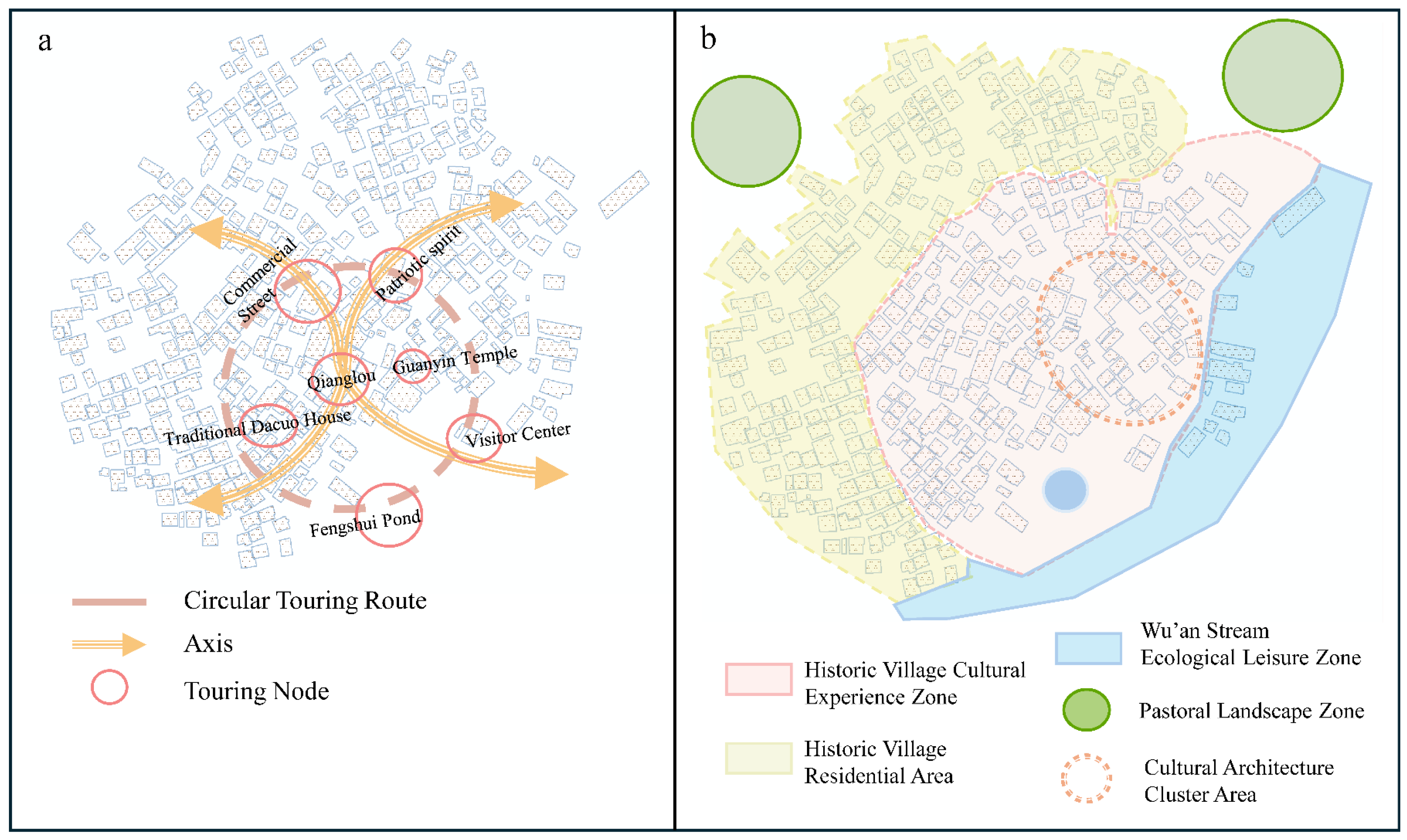 Figure 2. Overview of the Study Area. (a) Wulin Village Planning Structure, (b) Wulin Village Functional Zoning.