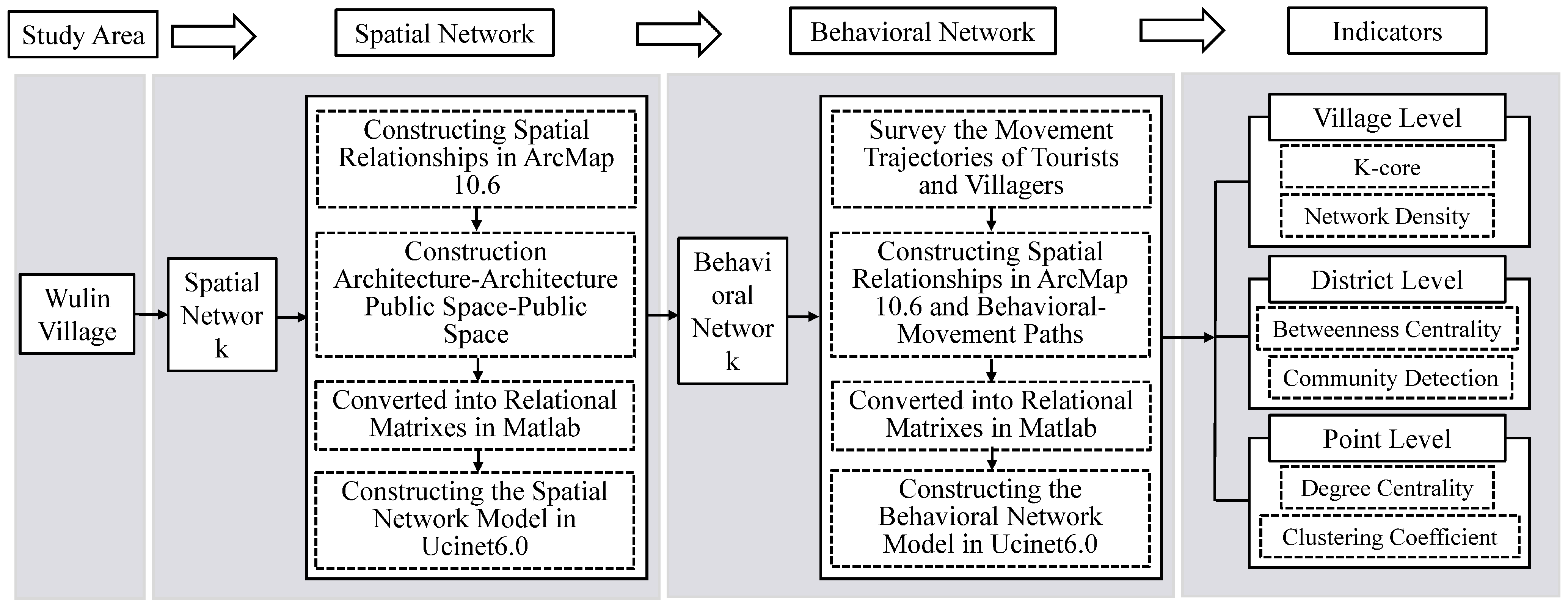 The data processing process (Figure 3) is as follows: 1. The two-dimensional map of the current state of Wulin Village, captured by a drone, is imported into ArcMap 10.6, where the edges of the objective spatial elements (roads, buildings, public spaces) are quantified. Additionally, based on the survey data, the edges of the villagers’ and tourists’ behavior network elements (such as buildings/public spaces where villagers and tourists stay or gather, and behavioral paths) are also quantified. 2. The spatial connectivity function in ArcMap is used to obtain the “node-edge” relationships for the objective spatial and behavioral networks. 3. The data obtained from ArcMap is imported into Matlab 2019, where the relationships between the objective spatial network elements and behavioral network elements are converted into a matrix. 4. The obtained matrix is imported into Ucinet 6.0 to construct the network topology diagrams for both the objective spatial and behavioral networks. The software’s calculation functions are then used to compute the selected indicators. 5. Compare the data of various indicators for different types of networks and conduct a comparative analysis of the spatial network and behavioral network characteristics of Wulin Village.