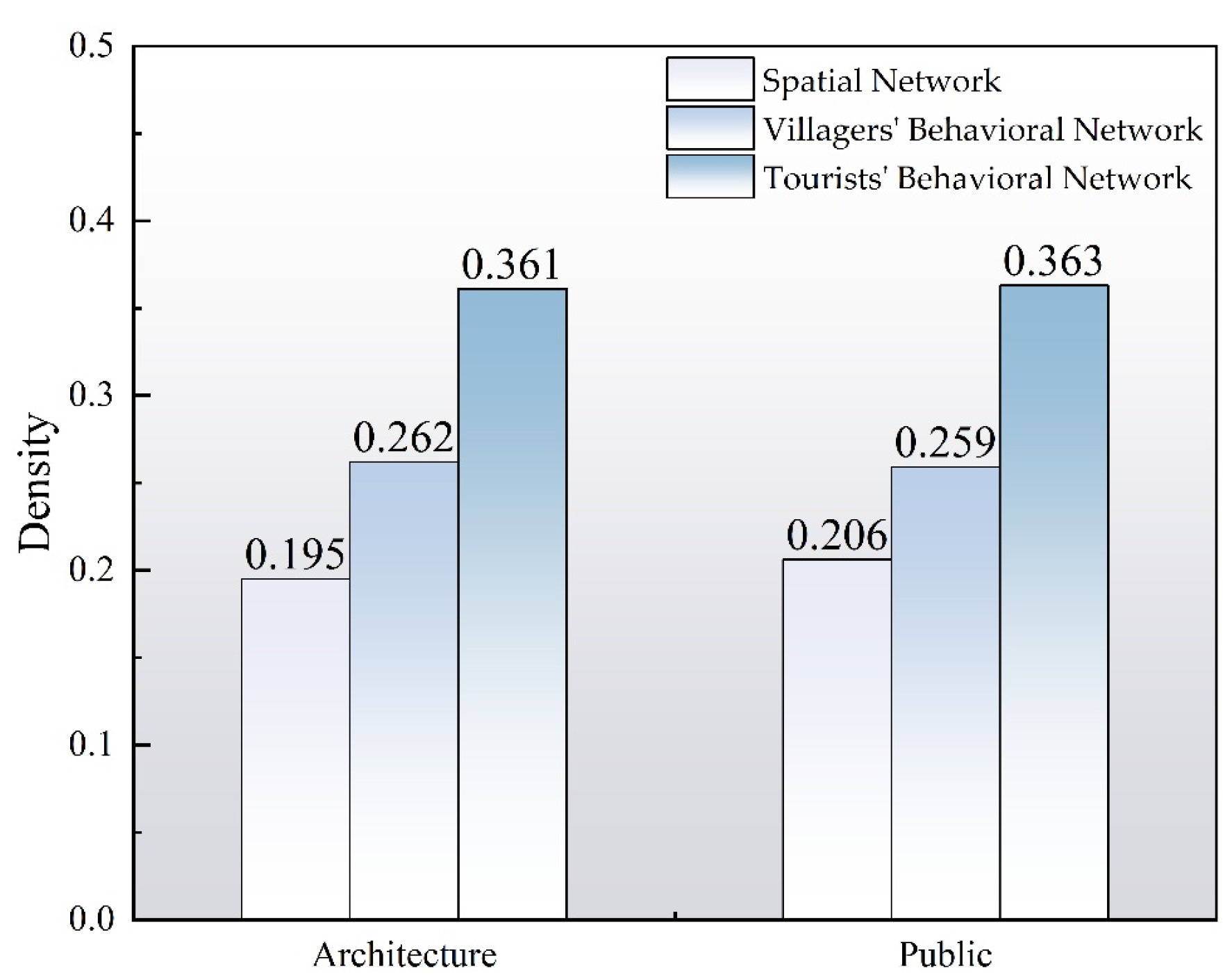 Figure 4 shows that the tourist behavioral network has the highest density (architecture: 0.361, public space: 0.363), followed by the villagers’ behavioral network (architecture: 0.262, public space: 0.259), while the objective spatial network has the lowest density (architecture: 0.195, public space: 0.206). Specifically, the high density of the tourist behavioral network indicates that tourists’ activity paths are relatively concentrated, primarily in the core areas of the Ancient Village Cultural Experience Zone (e.g., the ancestral hall, visitor center, and other cultural spaces). A high-density tourist behavioral network means that tourists spend more time and interact frequently in these areas, thus improving the spatial utilization efficiency of these locations. The high concentration of tourist behavior paths may suggest that the overall tourist experience is relatively efficient, especially in the core areas, where tourists can quickly access multiple cultural nodes, enhancing the continuity of their visit experience.