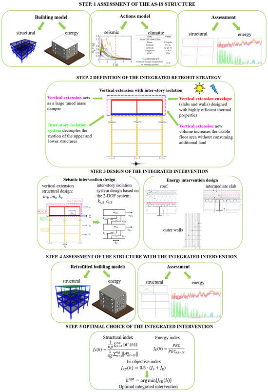Building upon previous frameworks for combined structural-energy retrofits, the present study adapts the methodology proposed in ref. [31] to the specific case of a vertical extension with an IIS as an integrated retrofit strategy. The proposed workflow, summarized in the flowchart of Figure 1, comprises five main steps, which are outlined below.
