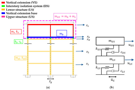 where the vector is the relative displacement of the lower structure; and are the mass, damping and stiffness matrices, respectively, which have the generic components , with i = 1–N; and is the unit influence vector. In order to reduce the dynamic response of the N-DOF structure it is assumed to add a vertical extension on the top of the existing building connected by means of a flexible and dissipative layer, i.e., the IIS, with an overall stiffness and damping . The vertical extension is modeled with a base mass, , that moves horizontally with relative displacement and a superstructure mass, , that moves horizontally with relative displacement , connected together with an elastic stiffness, , and damping coefficient, . The vertical extension represents the upper structure (US) connected to the lower structure with the IIS (Figure 2a).