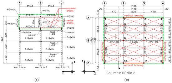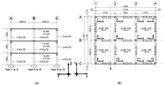 A literature case-study building is considered to apply the integrated retrofit strategy: it is represented by a three-story RC frame building constructed in the 1960s–1970s and originally designed to withstand gravity loads only, whose schematic representation with dimensions is illustrated in Figure 3, with further details reported in ref. [31]. The case study presented extends the one adopted in ref. [31] by introducing updated modeling assumptions for the finite element representation.