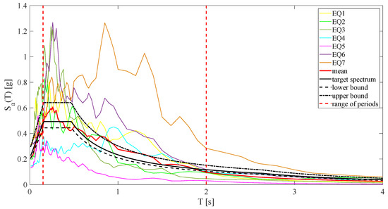 For the dynamic time-history analyses, seven real earthquake records were chosen from [39], adopting the Rexel software [40]. The selection was guided by the target spectrum from the Italian code [26] for the L’Aquila area, referring to the Life Safety limit state with a 10% chance of exceedance in 50 years (return period of 475 years), with details reported in ref. [31].