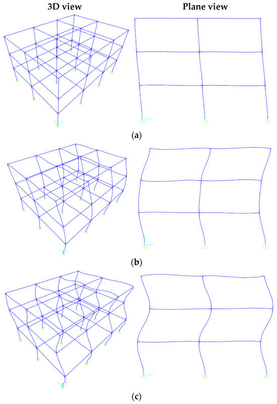 FEM model of the AS-IS building modal analysis (left side: 3D view; right side: plane view): (a) first mode; (b) second mode; (c) third mode.