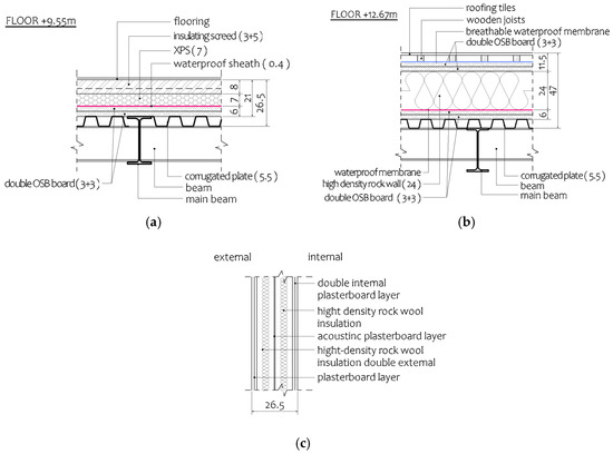 The conceptual layout of the retrofit intervention is illustrated in Figure 2a. The proposed strategy involves the addition of a one-story vertical extension, with the total height of the new level matching the inter-story height of the existing structure. The materials, structural systems and thermal insulation solutions adopted for the intervention are designed in compliance with current construction standards and energy efficiency regulations.