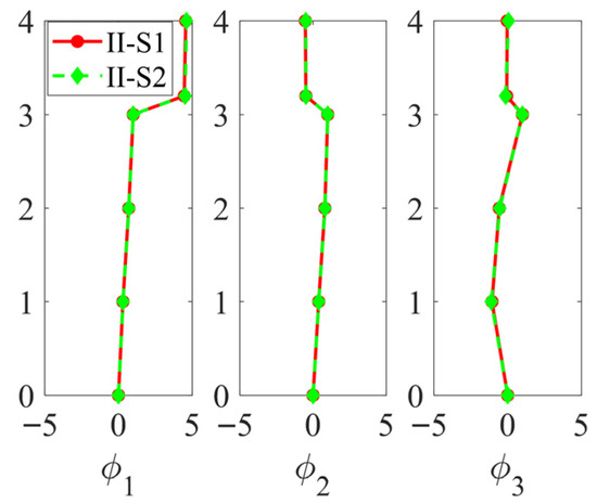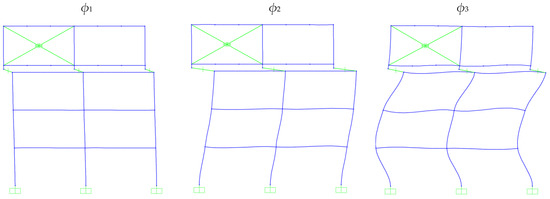 As intrinsic dynamic parameters, they are independent of the seismic excitation. The first three modes of vibration obtained from the 3D model of the existing building, in the following indicated as AS-IS, in plane analysis are depicted in Figure 5, while the corresponding vibration periods and participating mass ratios are reported in Table 5. The eigenvector corresponding to the first mode, ϕLS = [0.34 0.76 1]T, is adopted as a shape function to obtain the 2-DOF model characteristics. It can be observed that the first three modes excite almost the entire mass of the building; as a result, they are sufficient to describe the overall structural dynamic behavior. The three modes are well separated, with the first mode exciting 87% of the mass in translational motion along the y-axis. The high percentage of mass participation in the first mode suggests that a reduced single-degree-of-freedom (SDOF) model is adequate to represent the dynamic behavior of the AS-IS building for the design of the retrofit intervention. Based on the results of the modal analysis, given that the total mass of the building is 447.34 kNs2/m, the AS-IS building reduced-order model parameters are = 241.192 kNs2/m, = 8.38 rad/s and . Such parameters, evaluated as described in Table 1, are utilized for the design of the vertical extension with the IIS.