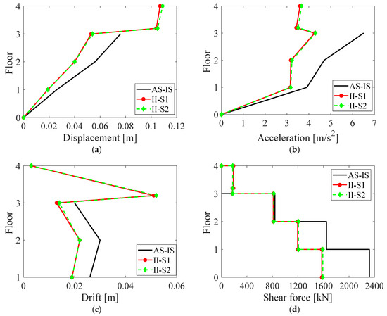 It is worth highlighting that the same performance indices, and were also adopted by the authors of [31] to evaluate the effectiveness of other integrated strategies employing different passive control systems. This consistency allows for a direct and meaningful comparison of the performances of the present vertical extension with the IIS and previous results reported in the literature. Such a comparison is further justified since the same case-study building and action models were employed in both studies. For this purpose, the integrated interventions II-S1 and II-S2 proposed in this work are compared with two retrofit configurations taken from [31], both based on the TMD concept and applied at the roof level of the same building: