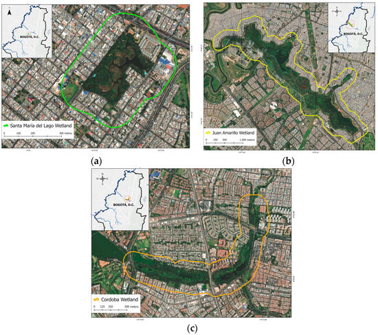 Location of the three urban wetlands under study in the city of Bogotá: (a) Santa María del Lago Wetland (green outline), (b) Juan Amarillo Wetland (yellow outline), and (c) Córdoba Wetland (orange outline). Each map depicts the official wetland boundary, water bodies represented by blue lines, and the surrounding urban environment. Insets show their position within the Salitre River sub-basin and the urban area of Bogotá. Source: Google Earth Pro, Version 7.3.6 (Google LLC, Mountain View, CA, USA). Satellite imagery (2023), WGS 84 projection, scale 1:5000; north oriented at the top.