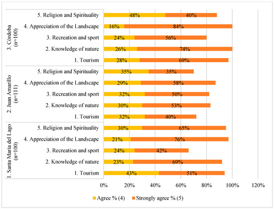 When analyzing the two highest categories of the Likert scale (4 = Agree and 5 = Strongly agree), CES 4 (Appreciation of the landscape) and CES 2 (Knowledge of nature) emerge as the most highly valued across the three wetlands. In addition, CES 3 (Recreation and sports) and CES 1 (Tourism) also show notable relevance, with the following results: in the Santa María del Lago Wetland, CES 1 reached 94% and CES 3 reached 66%; in the Juan Amarillo Wetland, CES 1 obtained 72% and CES 3 obtained 62%; and in the Córdoba Wetland, CES 1 reached 97% and CES 3 reached 80% (Figure 5).