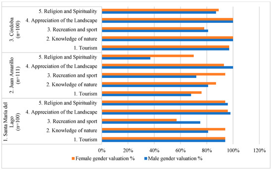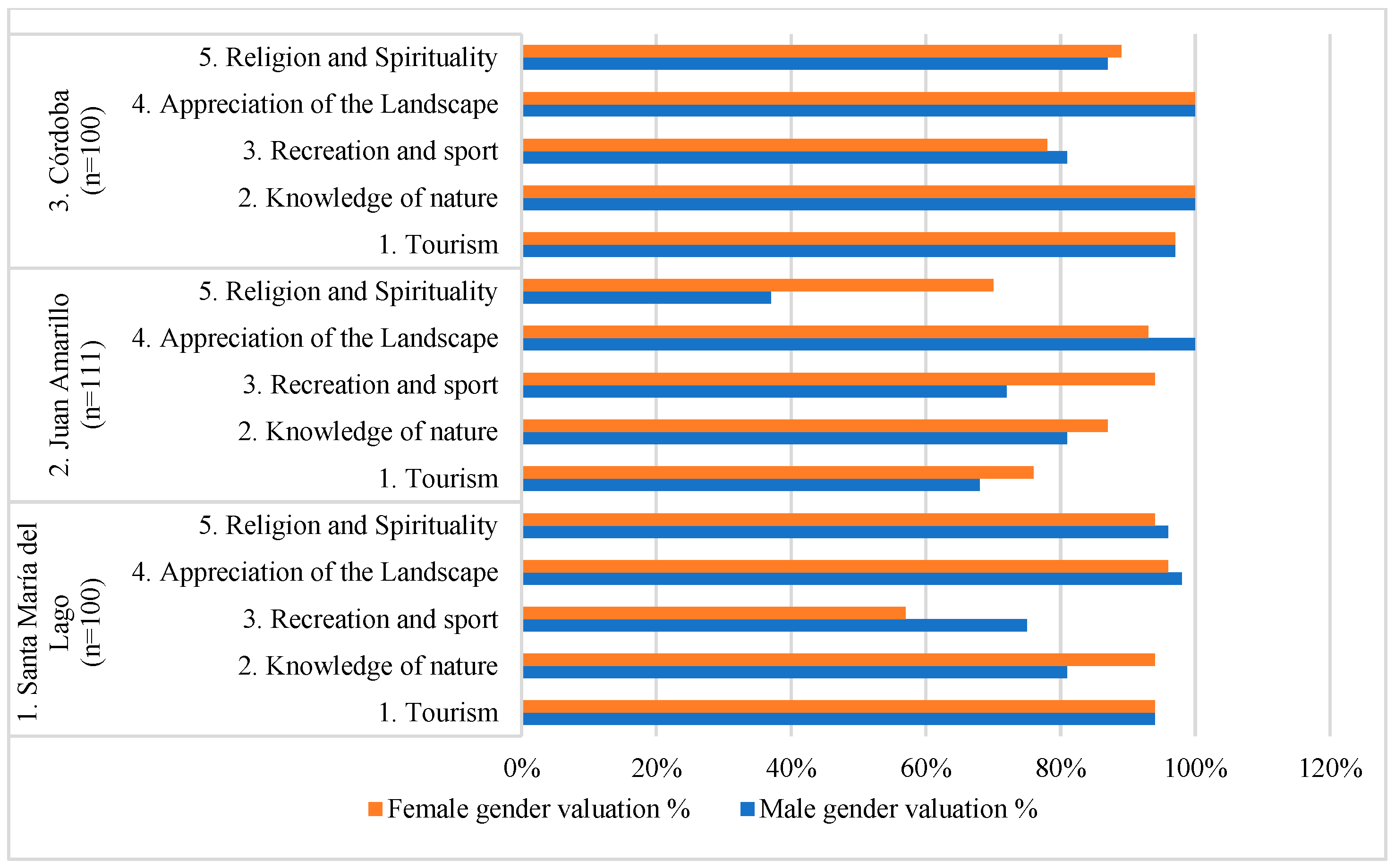 Based on survey data for visitor gender (women and men) in the three wetlands, and considering the two highest categories of the Likert scale (4 = Agree and 5 = Strongly agree), the CES with the highest values were identified as follows: In the Santa María del Lago Wetland, both women and men assigned the highest valuation to CES 4 (Appreciation of the landscape), with 96% and 98%, respectively. In the Juan Amarillo Wetland, women gave the highest rating to CES 3 (Recreation and sports) at 64%, whereas men assigned the highest rating to CES 4 (Appreciation of the landscape) at 100%. In the Córdoba Wetland, both women and men rated CES 4 (Appreciation of the landscape) and CES 2 (Knowledge of nature) equally high, with 100% in both cases (Figure 6).