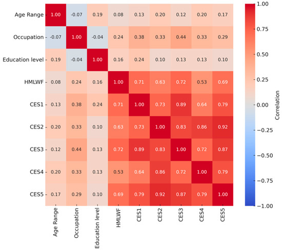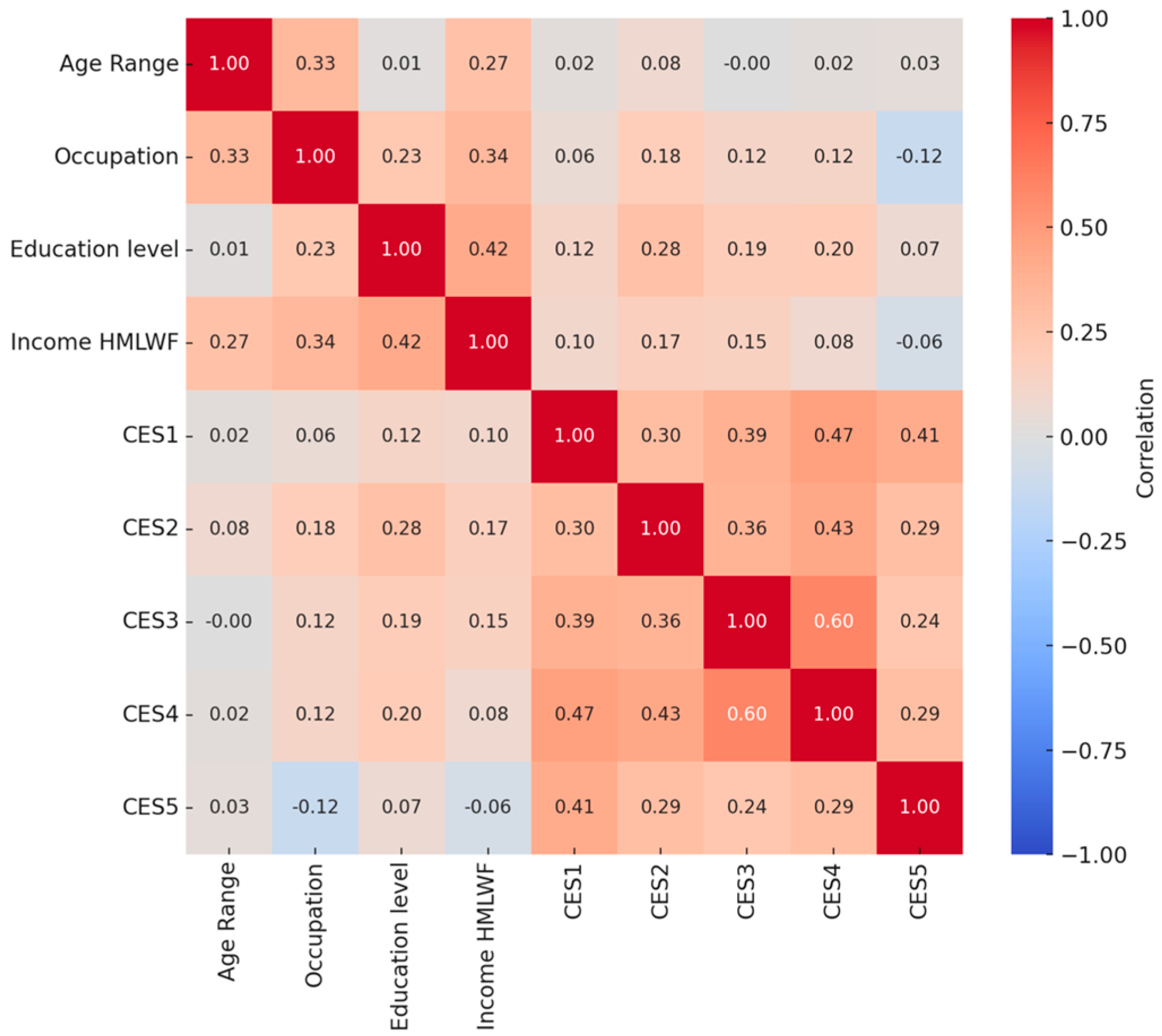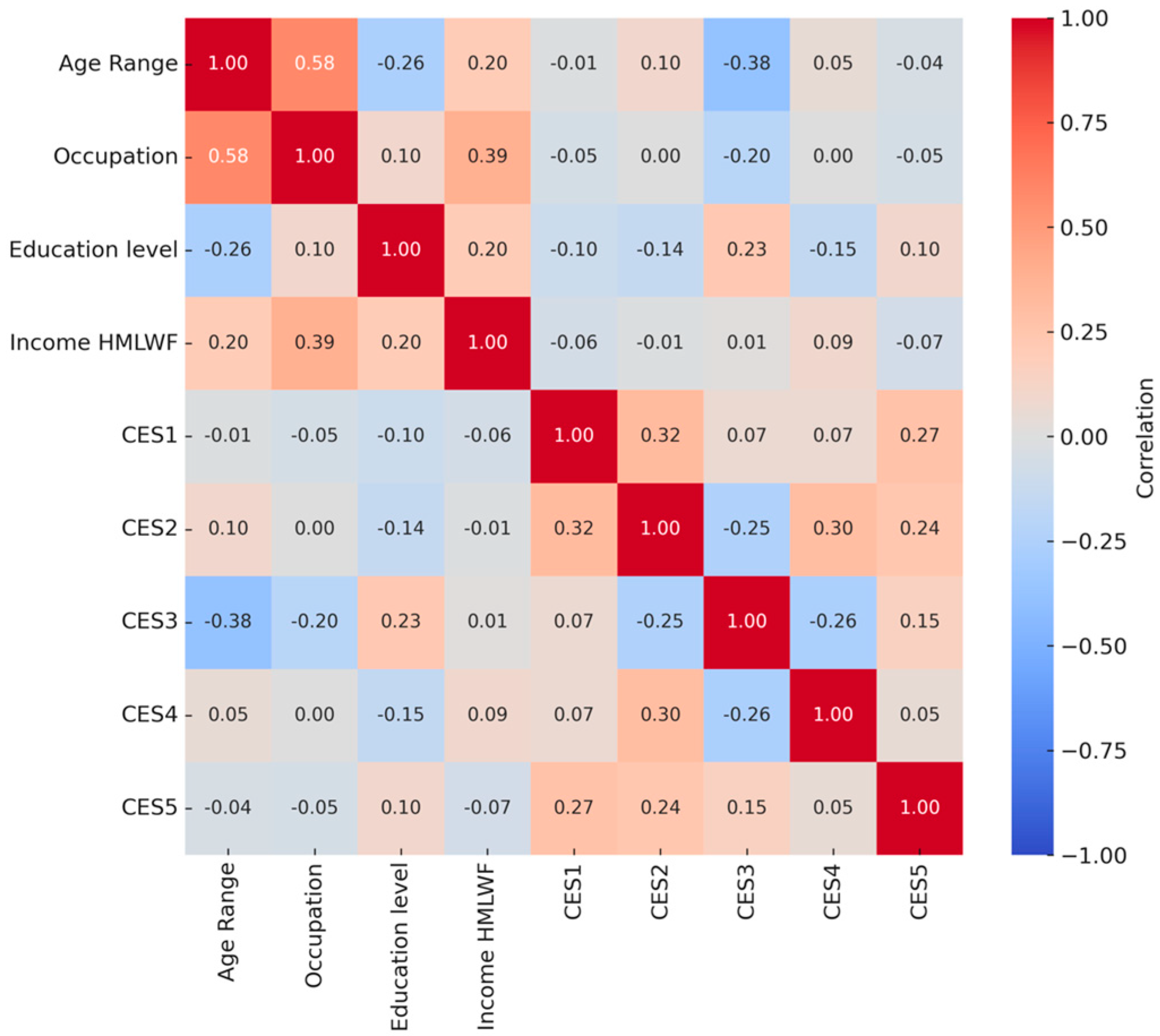 For the Córdoba Wetland, a “moderate to strong” positive correlation (0.51–0.75) was found between age range and occupation (ρ = 0.583, p < 0.01). Additionally, four “weak” positive correlations (0.26–0.50) and four negative correlations were identified. The weak positive correlations were occupation and economic income (ρ = 0.394, p < 0.01); CES 1 and CES 2 (ρ = 0.318, p < 0.01); CES 1 and CES 5 (ρ = 0.273, p < 0.01); and CES 4 and CES 2 (ρ = 0.301, p < 0.01). The negative correlations were age range and education level (ρ = −0.261, p < 0.01); age range and CES 3 (ρ = −0.377, p < 0.01); and CES 3 and CES 4 (ρ = −0.264, p < 0.01) (Figure 9).