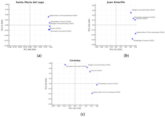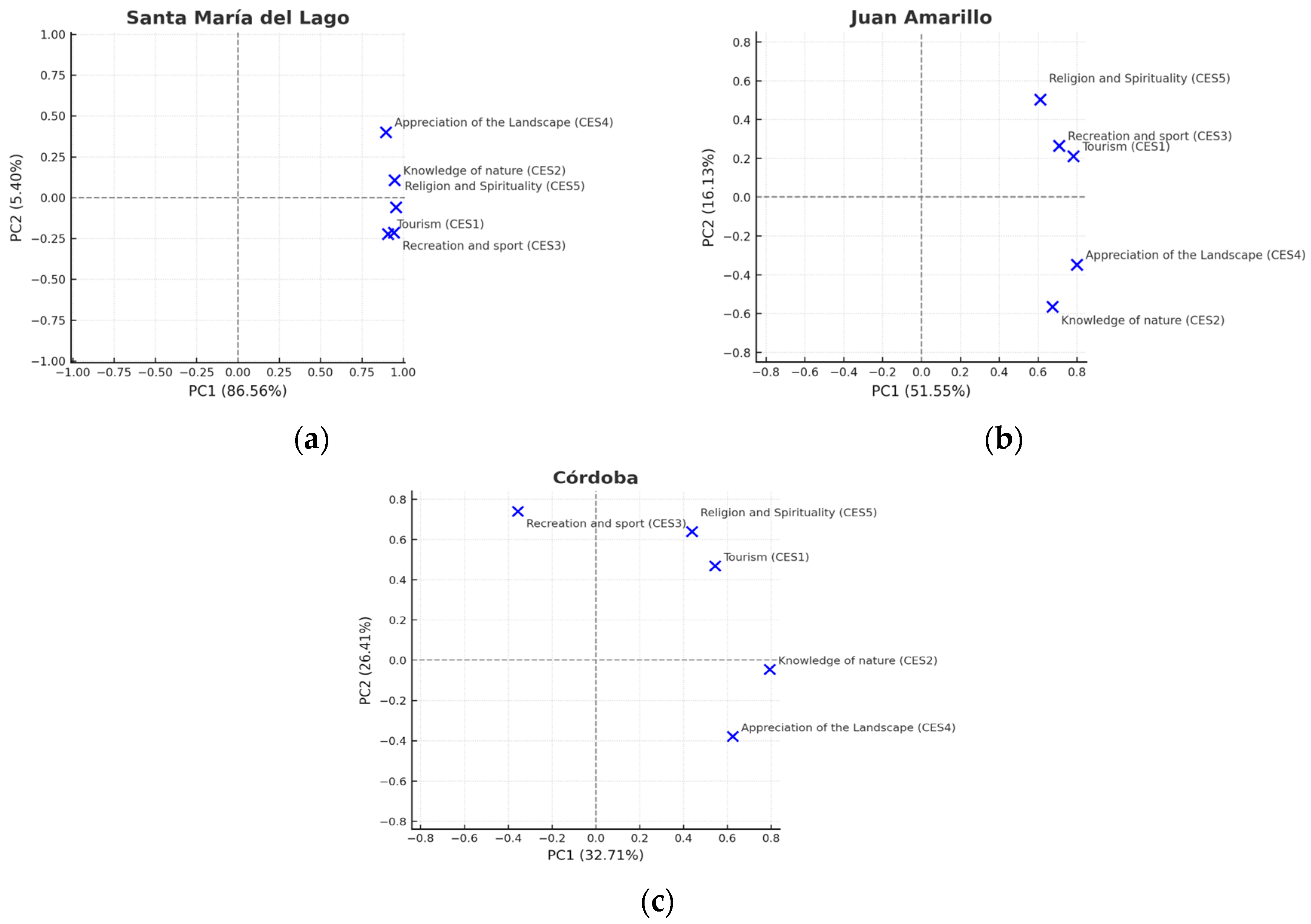 In the Córdoba Wetland, the two retained components explained 59.13% of the total variance—the lowest among the three wetlands. Component 1 (PC1), accounting for 32.71%, was mainly determined by Knowledge of nature (CES2), followed by Landscape appreciation (CES4) and Tourism (CES1). Component 2 (PC2), explaining 26.41%, showed its highest positive loadings for Recreation and sports (CES3) and Religion and spirituality (CES5) (Table 6, Figure 11c). Unlike Santa María del Lago and Juan Amarillo, Córdoba showed no marked dominance of a single cultural ecosystem service, suggesting a more balanced yet more dispersed perception, without clearly defined perceptual axes.