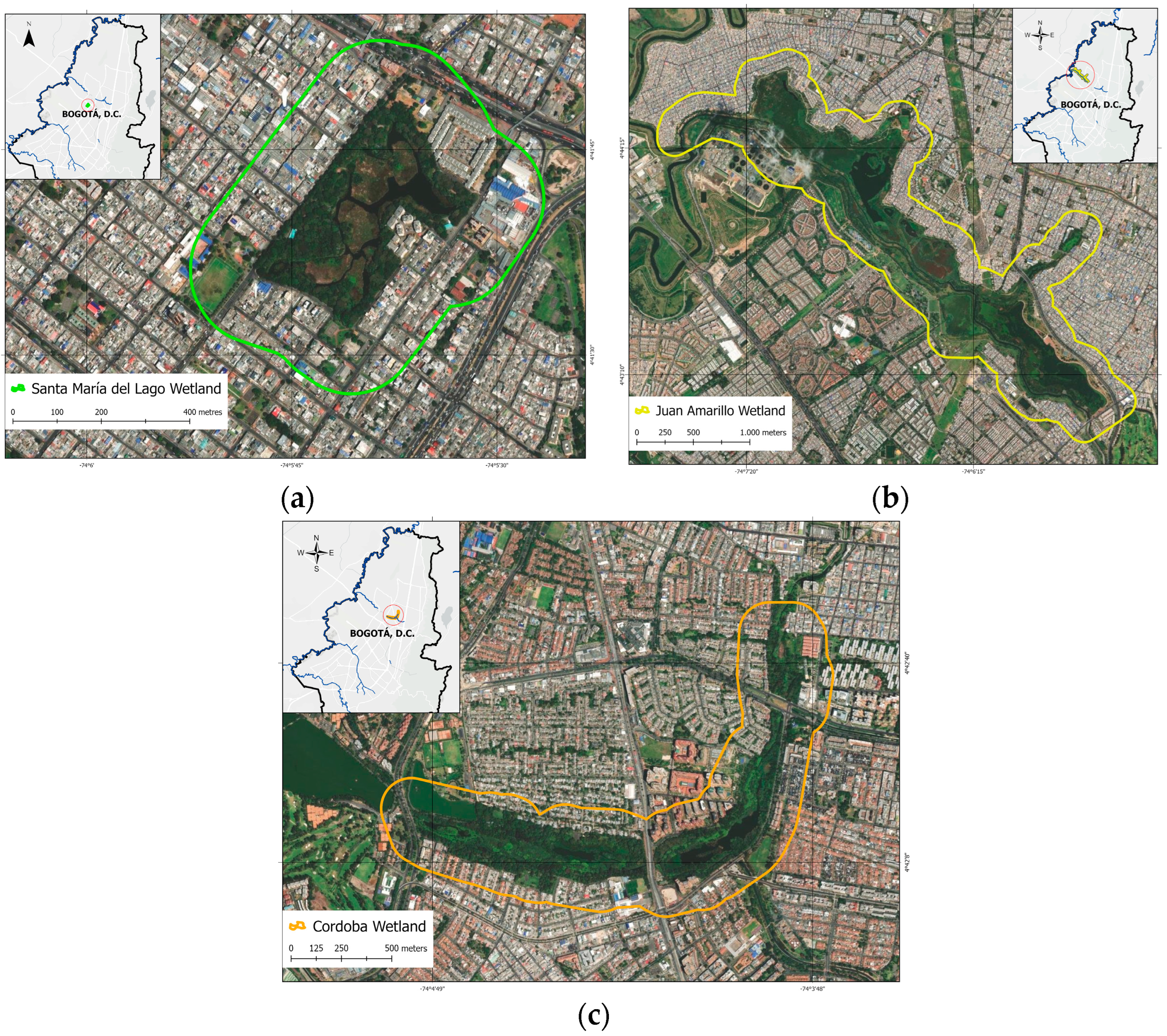 This study was conducted in three urban wetlands located in Bogotá, the capital of Colombia: Santa María del Lago (4°41′59″ N, 74°05′56″ W), Juan Amarillo (4°43′51″ N, 74°05′15″ W), and Córdoba (4°42′39″ N, 74°04′36″ W). These ecosystems lie within the Salitre River sub-basin, a tributary of the Bogotá River, and have been designated as District Wetland Reserves under the Capital District Protected Areas System [27,29] (Figure 1).