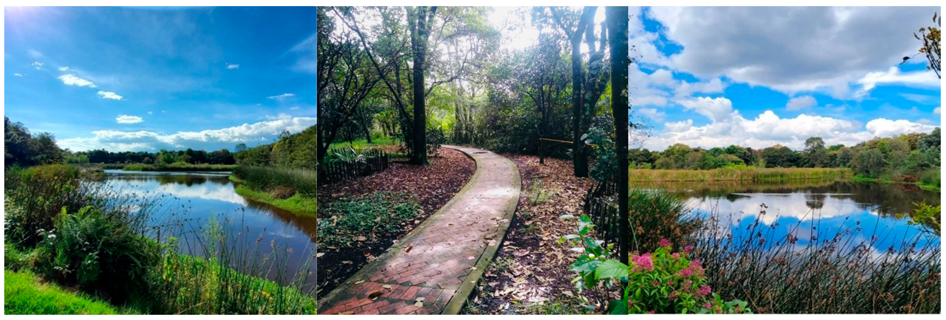 In urban wetlands, perceptions are shaped by landscape configuration and its spatiotemporal dynamics [17], as well as by contrasts between green–blue components that influence self-reported well-being [18]. Neighborhood typology and ecosystem accessibility also produce socio-spatial segmentation: areas closer to and better connected with wetlands tend to display greater diversity and higher valuation of CES, whereas distance and lower levels of access dampen their recognition [19]. Moreover, recent literature indicates that urban residents typically assign high importance to CES, yet evidence on visitors’ valuations remains limited—justifying a focused analysis in Bogotá, Colombia [13,14].