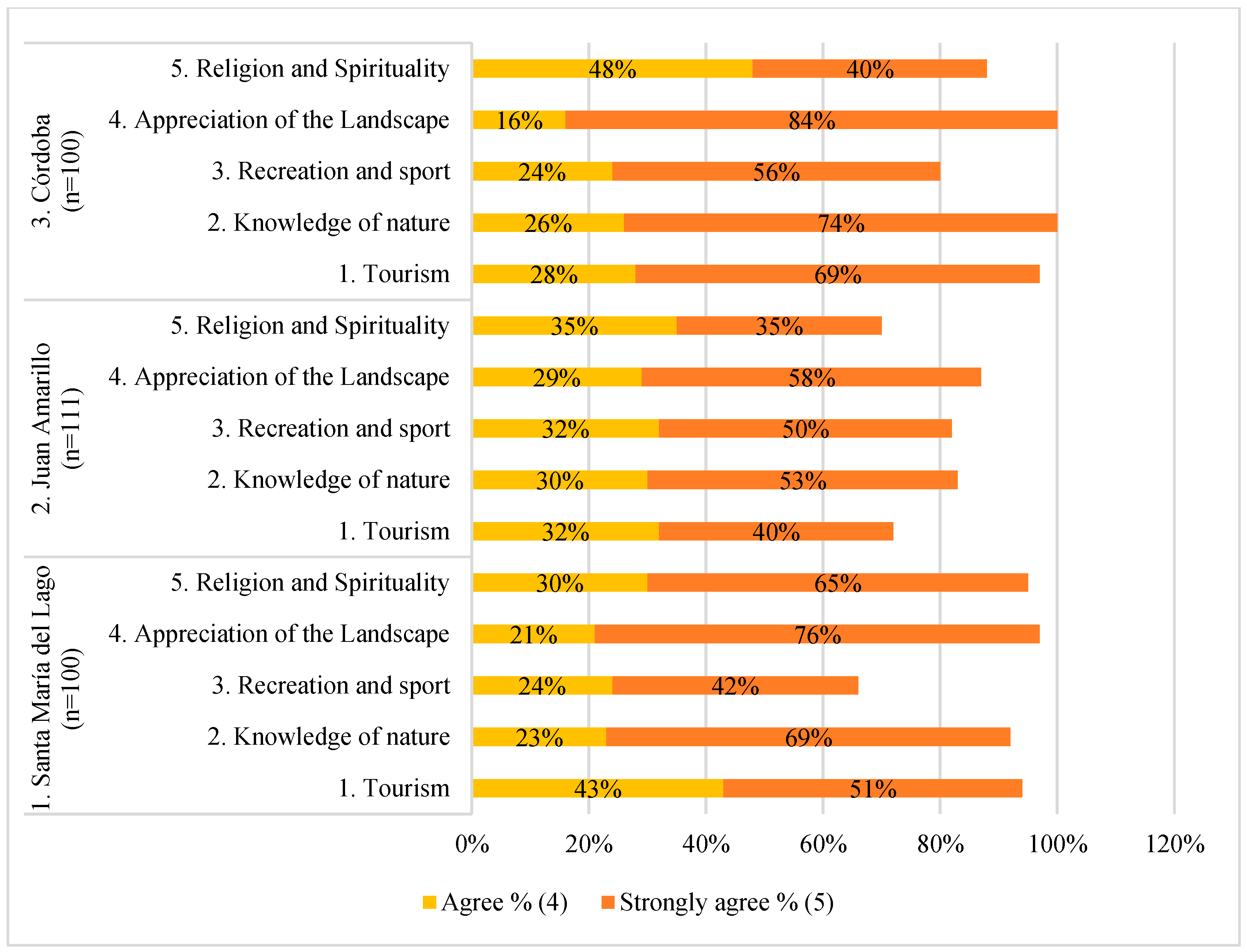 The CES were identified and assessed in the three wetlands—Santa María del Lago, Juan Amarillo, and Córdoba—using a Likert scale [45]. Each visitor evaluated five specific CES: (1) Tourism, (2) Knowledge of nature, (3) Recreation and sports, (4) Appreciation of the landscape, and (5) Religion and spirituality. Ratings were assigned on a scale from 1 to 5, where 5 indicated the highest degree of preference for each activity within the ecosystem [39].