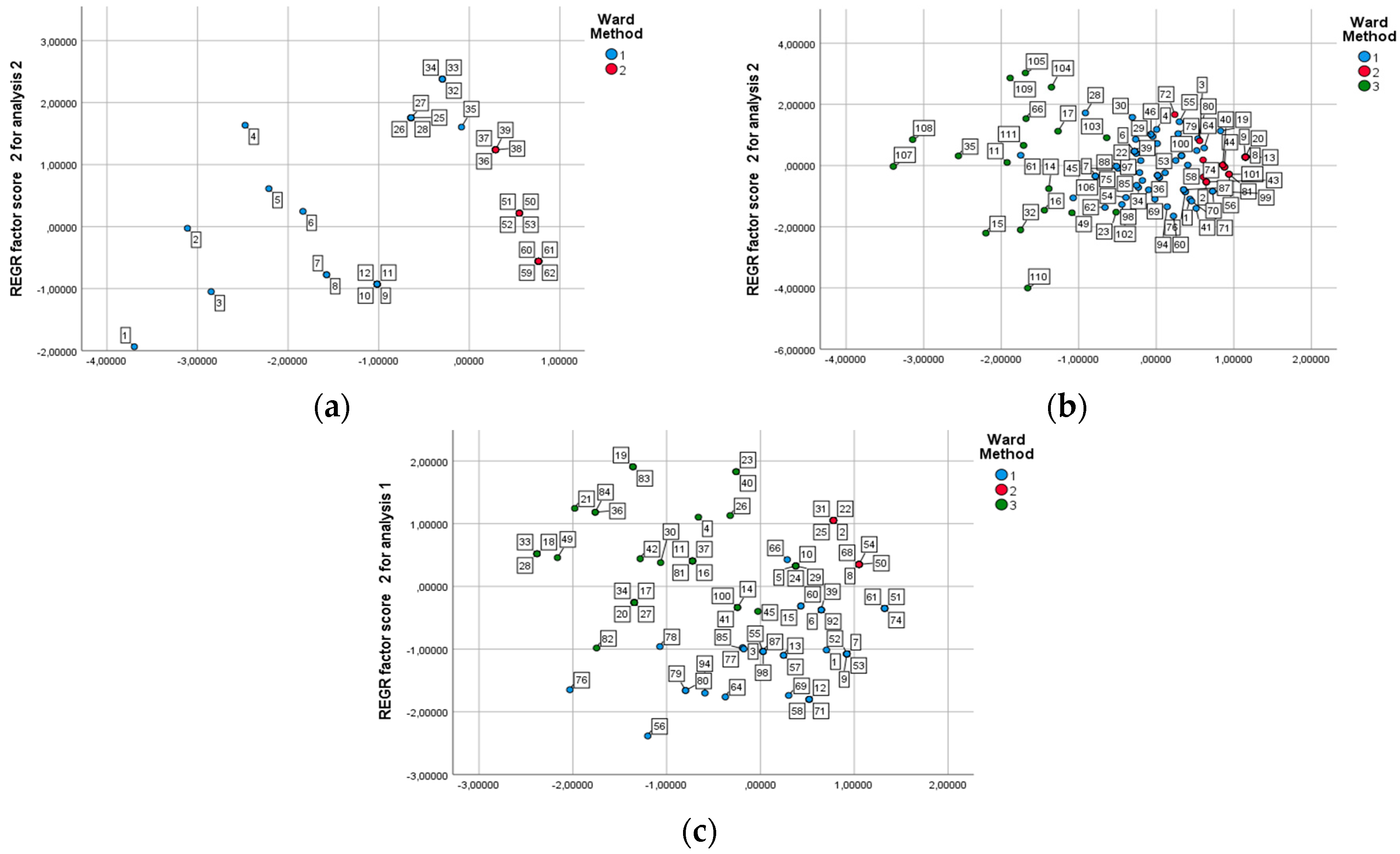 Scatter plots from Ward’s hierarchical clustering method for wetlands: (a) Santa María del Lago, (b) Juan Amarillo, and (c) Córdoba, Bogotá, Colombia.