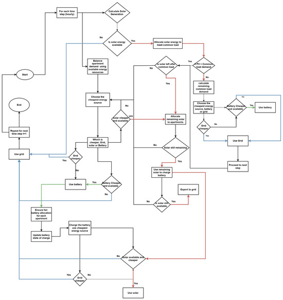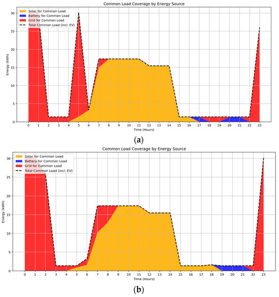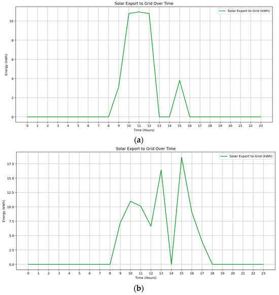 The EMS dynamically evaluates the relative cost of solar, battery discharge, and grid electricity to prioritize the most economical source at each time step. Solar energy is preferentially allocated to common loads without charge, thereby maximizing on-site renewable utilization. Excess solar generation beyond the combined demand and battery charging capacity is exported to the grid. The exported energy is priced using DEBS time-of-use tariffs: $0.10/kWh during peak hours (15:00–21:00) and $0.02/kWh during off-peak periods, creating a modest revenue stream for the strata [51,52].