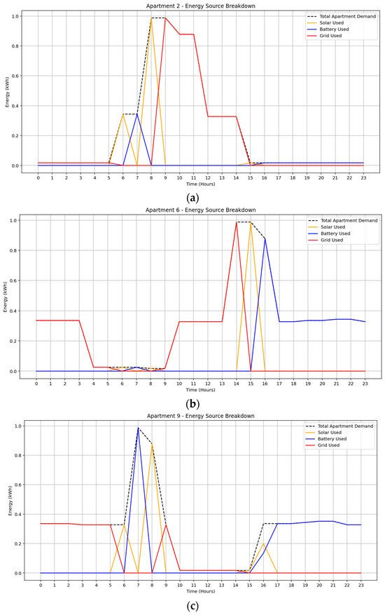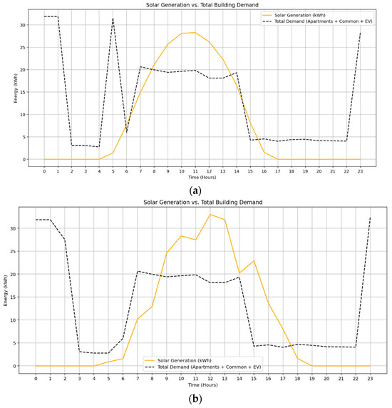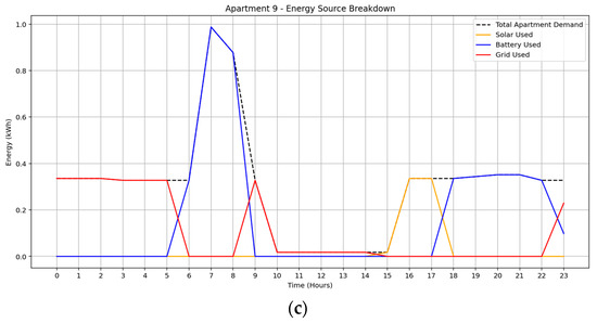 Each apartment was assigned a fixed appliance suite and usage schedule according to its assigned profile, enhancing the realism of load distribution under time-of-use pricing and renewable generation constraints. These profiles also support differentiated demand response strategies based on user flexibility [35,36]. Power ratings, daily runtimes, and energy ratings were derived from real product specifications to ensure accurate simulation inputs. Each apartment’s daily energy demand was structured over a 24 h horizon with 1 h resolution, resulting in individualized load profiles that collectively represent the building’s total demand. Shared infrastructure components were included in the synthetic dataset as fixed daily common loads, with operational scheduling aligned with solar availability.