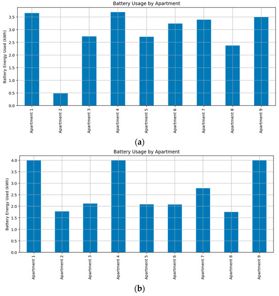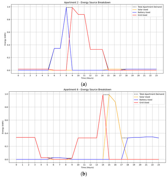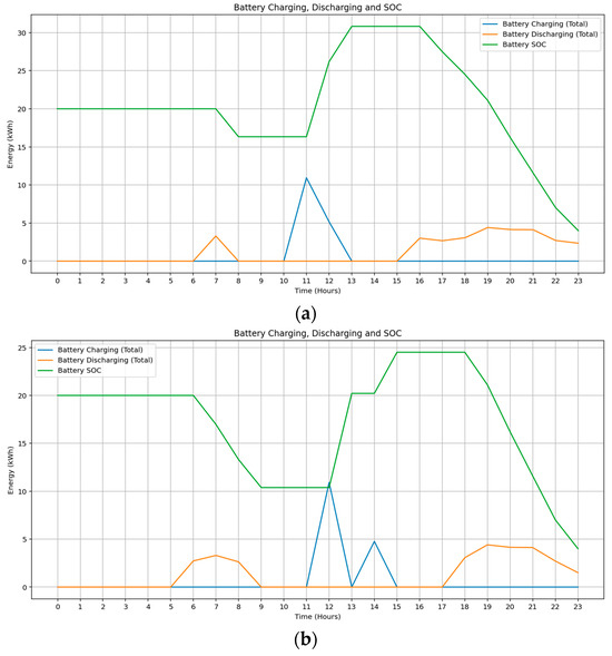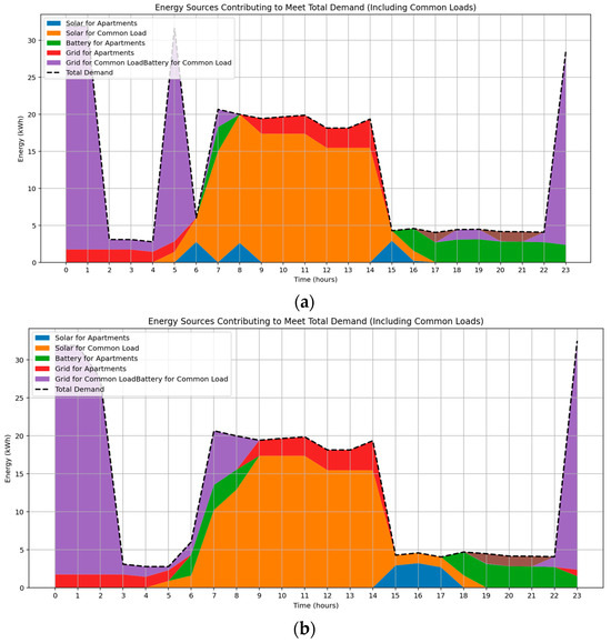 Community batteries are not constrained by specific timeframes for charging and discharging. Unlike some storage systems that have designated periods for energy input and output, community batteries offer flexibility in terms of when they can charge and discharge. Battery operation follows a cost-optimized logic, where charging is prioritized from rooftop solar PV generation, with grid energy used as a secondary source when solar availability is insufficient. Charging and discharging actions are scheduled dynamically using a MILP framework, which ensures optimal source allocation at each hourly time step across a 24 h horizon. The integration of battery operations, including both charging and discharging behavior, is embedded within the mathematical optimization model and explained in detail in Section 2.5. Through this optimized control framework, the battery system enables grid load smoothing, peak shaving, and enhanced utilization of renewable energy resources, while facilitating community energy sharing within the multi-story residential building.