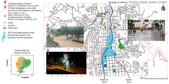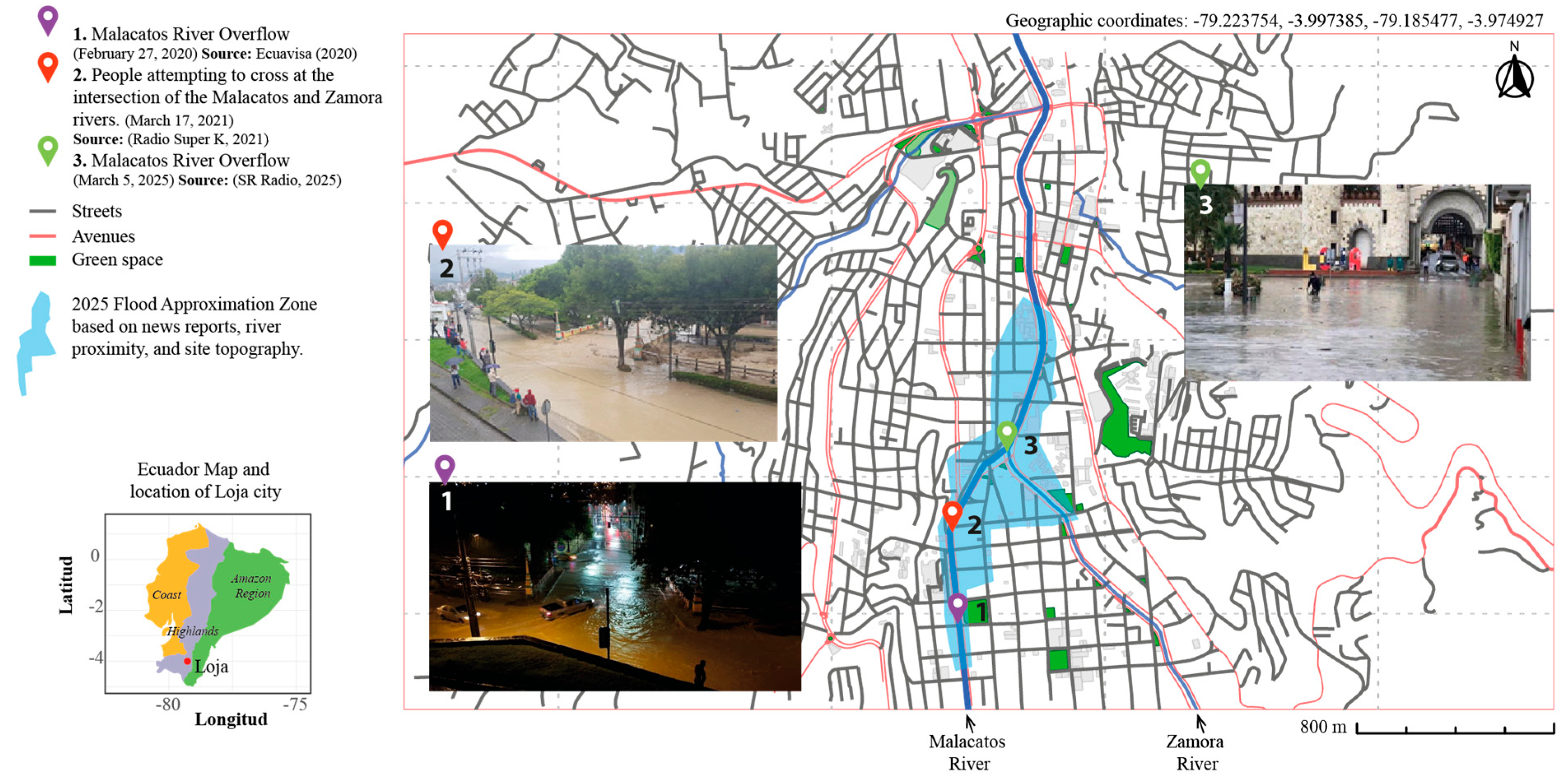 The flood polygon was derived from documented historical flood reports and media sources because no official hydrodynamic model or high-resolution flood map is currently available for Loja. While this approach captures the main areas historically affected by river overflows, we acknowledge that it does not fully represent hydraulic processes such as water depth or flow velocity. Future work could incorporate two-dimensional hydrodynamic modeling (e.g., HEC-RAS 2D or LISFLOOD-FP) or GIS-based inundation mapping using digital elevation data to refine spatial accuracy and enhance reproducibility.