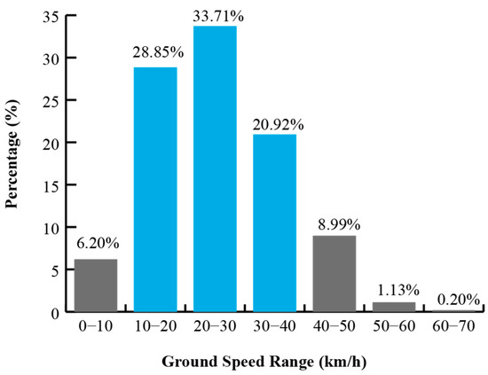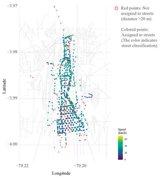 Figure 8). Distances for these points ranged from nearly zero to the 20-m threshold, with an average of approximately 4.8 m and a median of 3.2 m. By street type, most points were on residential streets (48.8%), followed by primary roads (31.3%) and tertiary roads (9.2%). A street-level analysis revealed variations in average speeds; for instance, 8 de Diciembre Avenue had a mean speed of 35.4 km/h (47 points), while 10 de Agosto Avenue showed a lower average of 23.4 km/h (43 points), reflecting different traffic conditions.